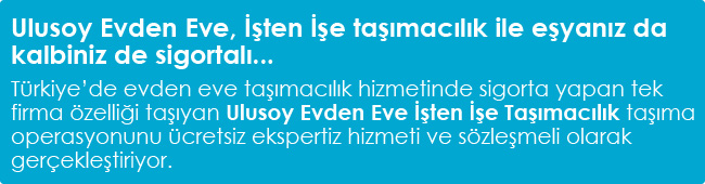 06 Nisan 2011, İstanbul; Kalitesi ve güvenirliğiyle ulaşım sektörünün köklü firmalarından Ulusoy, deneyimlerini taşımacılık alanında da Evden Eve İşten İşe Taşımacılık markası ile sunuyor. Ulusoy Evden Eve İşten İşe Taşımacılık ücretsiz eksper hizmeti, sigortalı ve sözleşmeli taşımacılık güvencesiyle sektörde bir ilke imza atarak hizmet veriyor.