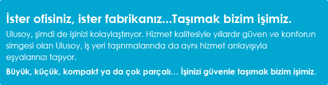 Ulusoy Evden Eve İşten İşe Taşımacılık, iç yapıları eşyalara zarar vermeyecek şekilde dizayn edilmiş araçlarıyla ofisinizi, fabrikanızı, malzemelerinizi tam zamanında ve tam güvenle, dilediğiniz yere taşıyor. Banka şubelerinden, ilaç şirketlerine, holding ofislerinden, askılı tekstil taşımacılığına, fabrika taşımacılığından, fuar taşımacılığına kadar oldukça geniş bir alanda eşya taşımacılığı hizmeti veren Ulusoy, seyahatte sunduğu özenli hizmet anlayışıyla bu alanda da yanınızda.